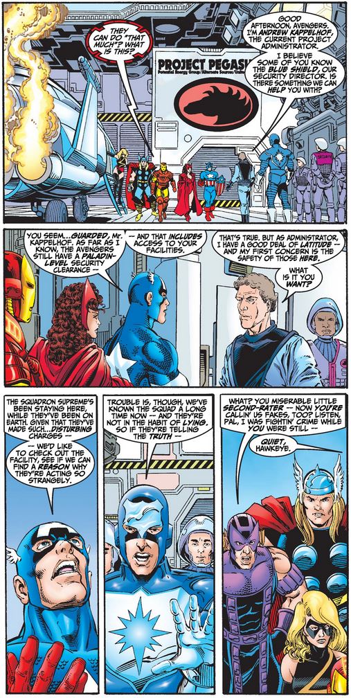 The Squadron Supreme recently went through it in the Squadron Supreme: Death of a Universe graphic novel alluded to above, and ended up in the 616, staying at Project PEGASUS and appearing in Quasar’s book for quite a while. But now they seem upset and skeptical that the Avengers are actually who they appear to be, and while Cap pleads for their cooperation with the current crisis, Hawkeye mutters an excellent point…