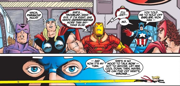 …unaware of both her declining powers and other members’ suspicion of an alcohol problem (Tony in the last issue, as we saw, and a similar incident with Wanda in the next, not shown here).