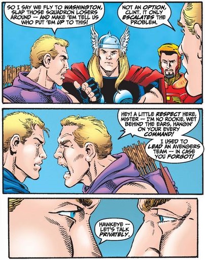 Wanda storms off (and finds Carol drinking in the kitchen, as mentioned above) while the rest of the team put a pin in Vision’s question and return to reacting to the Squadron’s statements, with Clint taking the lead and not backing down when Cap urges calm.