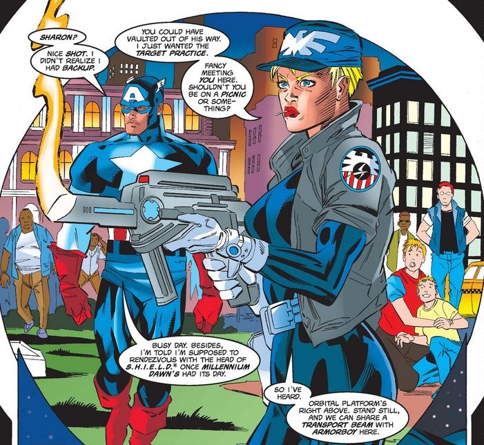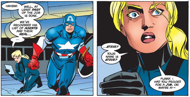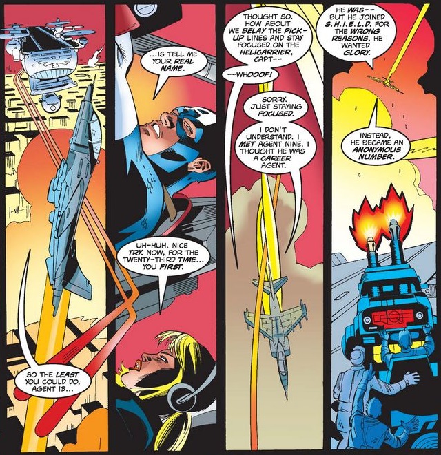 …when neither Cap nor Sharon knew each other’s real names. (To keep with the trend, they’re in pursuit of a renegade SHIELD agent, numbered nine.)
