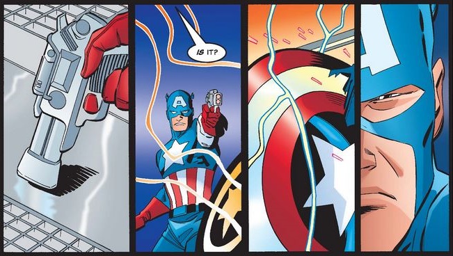Cap misses the Falcon, who apparently had a run-in with the Mad Thinker, which I don’t think has been shown; the Avengers do run into the Fantastic Four foe in 1999’s Fantastic Four #23, but Sam isn’t with them (and there is no mention of a “cerebomb”). Unfulfilled plan of Waid’s, maybe? Anyway, after some vagueness about his current shield, Cap is saved from the bad guy’s “laser razor” by a blast…