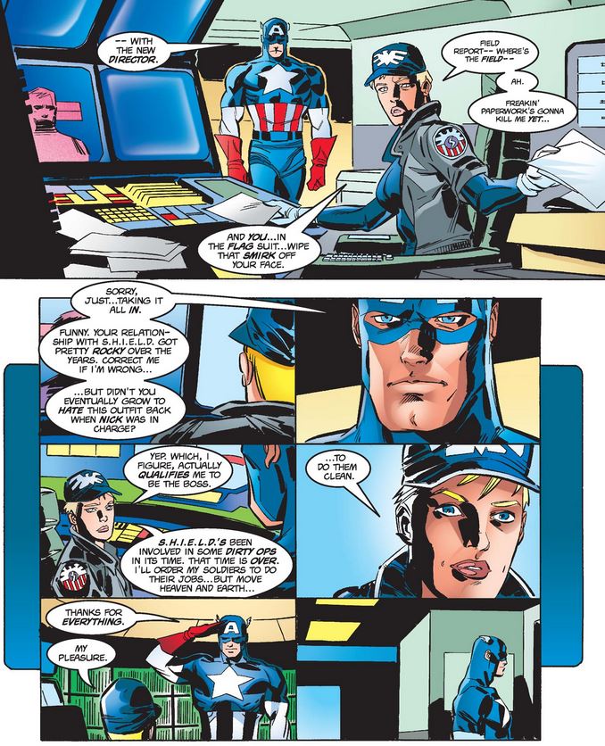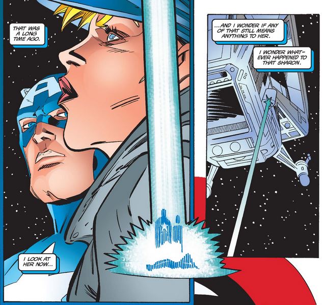 Back to the current day (in 2001), Cap wonders about Sharon now and if she would have the same reservations about making hard choices after everything she had been through in the years since her “death” in Captain America #237 (as recounted in issue #446). Or perhaps something was planned to take place between 1998 and 2001 to explain his concern, who knows.