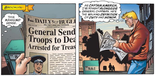 The story starts out with Sharon Carter talking to a police detective about a superstar baseball player who suddenly lashed out at fans, after which she reads the newspaper headline below, reporting events from the last issue not covered here—while an old friend reads the same headline and asks himself how it could be true, given his fine impression of the general (who eulogized Cap in issue #445).