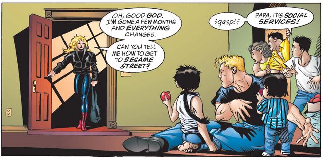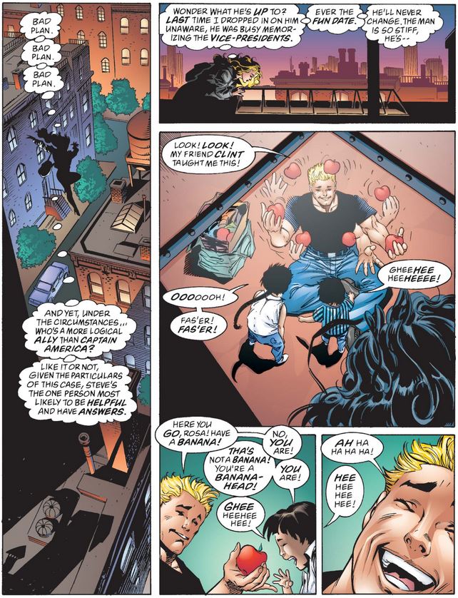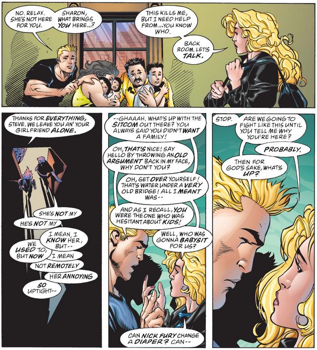 While Steve mulls over what to do, Sharon comes looking for him, torn over having to reach out, not having seen Cap since their dramatic parting in issue #454, well before the Onslaught Saga. She reflects on what a dreadful bore he was when they were together, but when she sees him playing and laughing with the Ramirez kids…