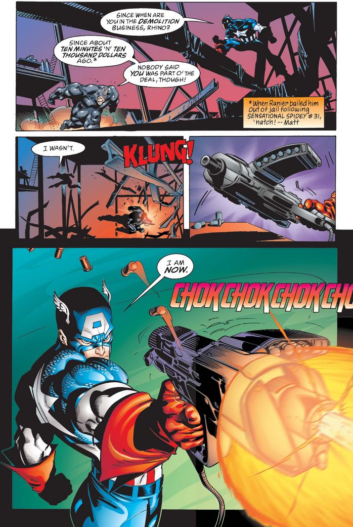 Ranier continues, “but I won’t let them have it!”, and points to his new hire, the Rhino, who starts to bring down the building under construction. This sets up the provocative image of Captain America firing a “gun”…