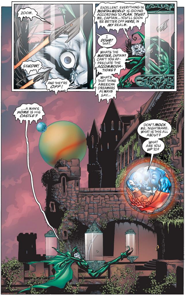Nightmare goes on to explain how he co-opted the American dream itself—taking the term a bit too literally, if you ask me—and used it to wheedle himself inside the minds of those who believe in it and succeeded at it to twist it into a nightmare suiting his name. As he draws more and more such people into his realm, he plans to use Cap to start a nuclear war (plunging the whole world into endless sleep and nightmare, mwa ha ha).