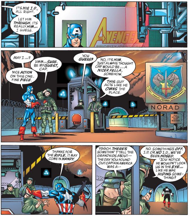 In the real world, the possessed Cap uses his credentials to gain access to the missile base, though he leaves the security personnel thinking he’s a bit off compared to his reputation.