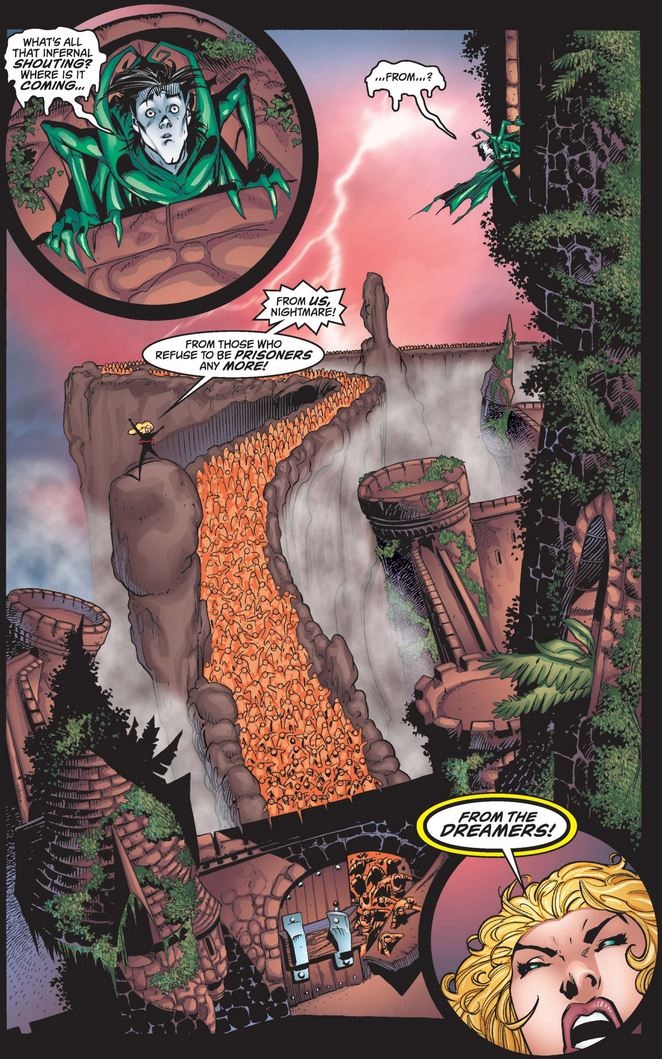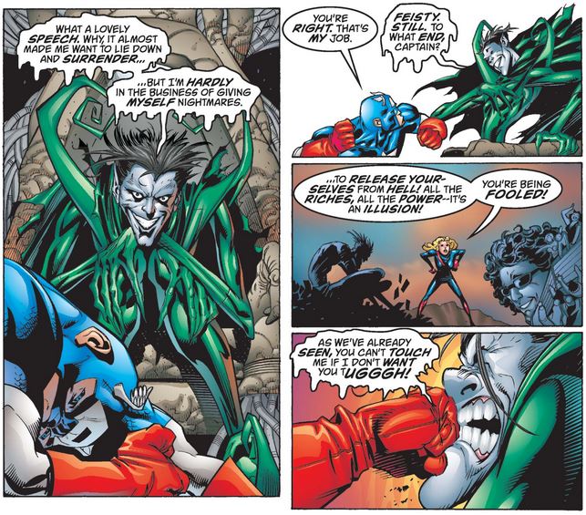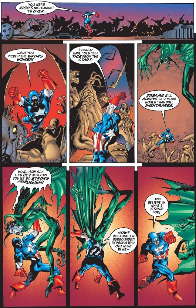 Cap fights his way up to Nightmare, arguing that dreams are more powerful than nightmares, presumably because they have the power to inspire, and his dream in particular is shared by many who truly believe in it.
