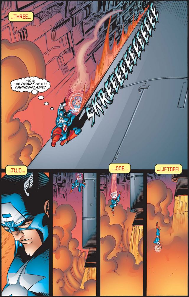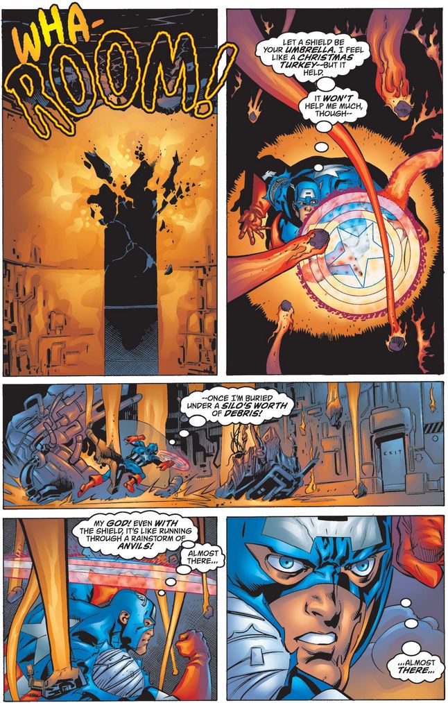 Cap isn’t in the clear yet, though: After the missile hits the closed door, the silo begins to collapse, much like the building in the last issue, so he has to dodge flaming metal while running to the door.