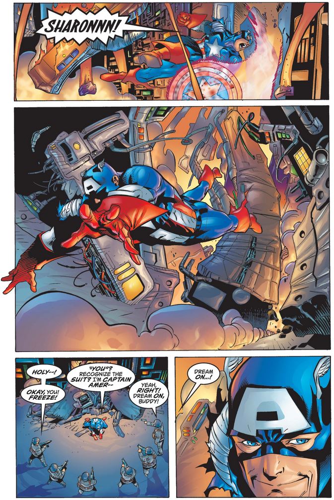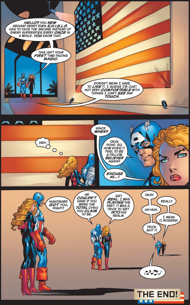 After the possessed Cap commandeers a jet, leaving Sharon grateful she doesn’t believe in “that ‘American dream’ claptrap,” Nightmare mocks the real Cap.