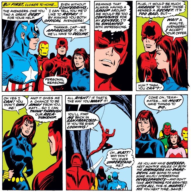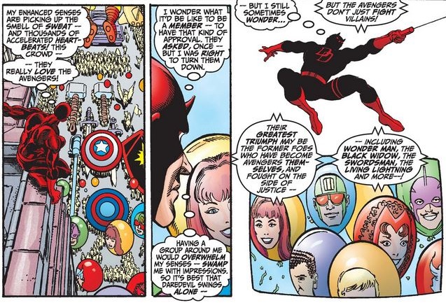 Another tribute comes from Daredevil, who reminds himself why he chose not to join when asked (in issue #111): sensory overload. (Mmhm, sure.)