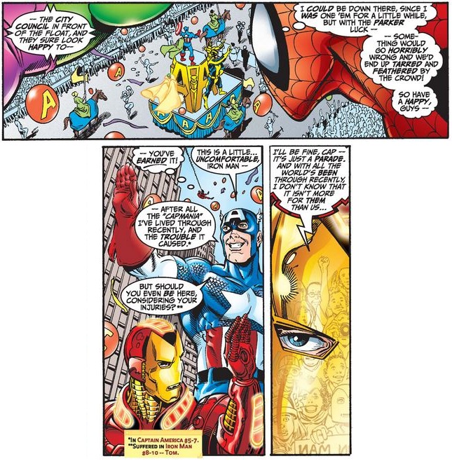 We also see other heroes silently paying tribute, starting with Spider-Man, wishing he were riding the float but thinking it’s better that he’s not, while Cap remembers the recent “Capmania” before asking Tony about his injuries. Leave it to Tony, of all people, to put the celebration into context (and dismiss Cap’s concerns about his true state of his health, which the armor does a lot to disguise).