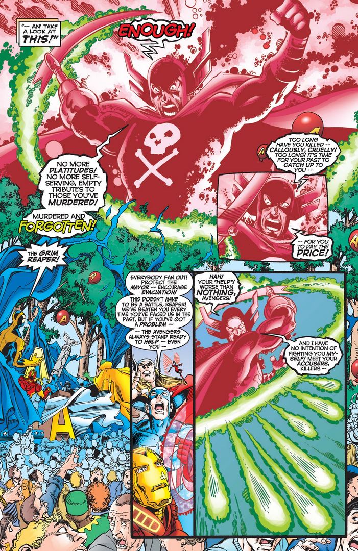 …which is the perfect time for the Grim Reaper to appear. Cap shows the compassion at the heart of the Avengers when he offers help, but the Reaper has other plans.