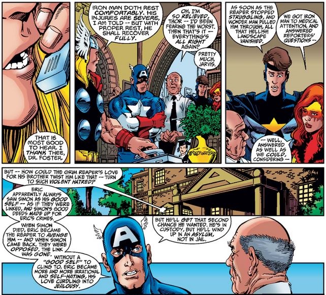 Because of this hesitance, the Avengers fall, and in issue #11 we see them held captive by the Grim Reaper, who’s whining about living under the shadow of his brother Simon (Wonder Man), while Justice references Iron Man’s injuries and his resolve to keep up the fight despite them.