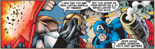 Finally, in the (singular) X-Man #46, Cap, Wanda, and Thor argue with each other and Nick Fury about the political precarity of intervening in Latverian affairs, with Cap giving his “situation pointing south” speech and Thor making the point that the Latverians are isolationist only because Doctor Doom (still on the “Heroes Reborn” world) made them that way.
