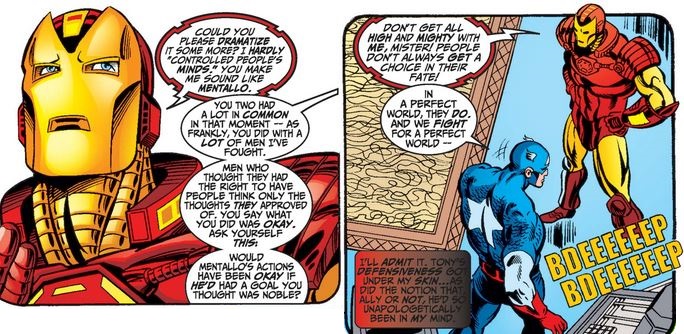 Here’s the kicker: After defeating Mentallo, Tony took advantage of his psychic link to the world to erase knowledge of his secret identity from anyone who might have it. This explains Cap’s anger with Tony in the present time, which we see in Cap’s thoughts below…