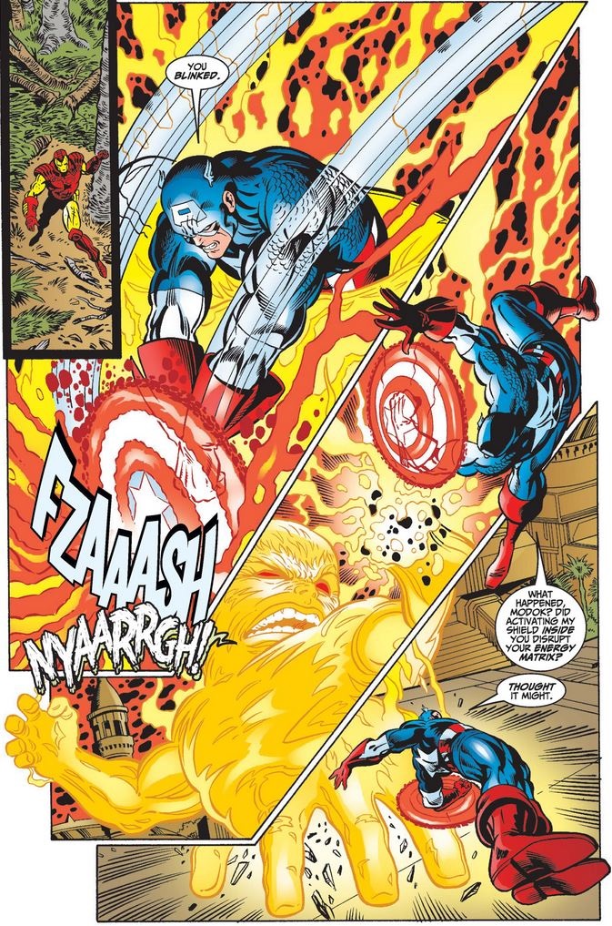 It was just a feint (despite Cap’s well-known antipathy for subterfuge), which allows him to use his new shield’s unique properties to short out MODOK’s energy form.
