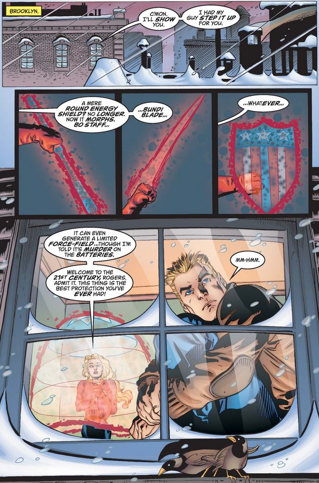Later, Sharon tries to cheer Cap up by showing him the upgrade pack she bought for his energy shield, but he doesn’t want to hear it.
