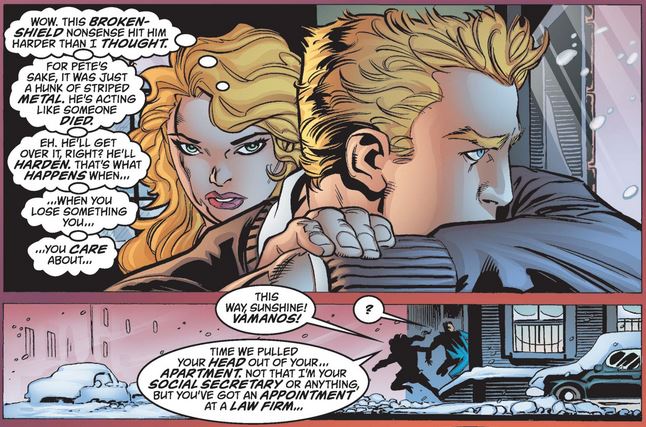 If he hadn’t forgotten Bernie by now, he might after he meets Connie Ferrari (first mentioned in Captain America: Sentinel of Liberty #1), who is unaware of his other life but admires him no less for it—and he feels the same.