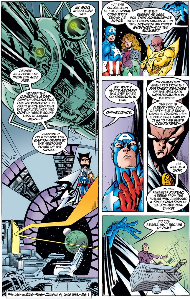 Despite the rush, Uatu says they have time for a field trip, so he takes Cap and Sharon to Galactus’s ship, which he says the Skull is trying to attract to Earth, at the suggestion of Kang the Conqueror (who has been advising/manipulating Skull behind the scenes)…