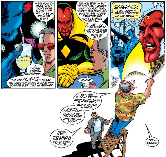 Cap is back by issue #14, most of which deals with the Beast’s return to greet his old friend Wonder Man, the levity of which also inspired some cute insets with Kurt Busiek and the late George Pérez.