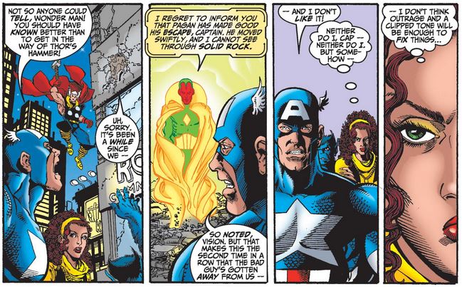 Avengers (vol. 3) #14, March 1999: Kurt Busiek (writer), George Pérez (pencils), Al Vey (inks), Tom Smith (colors), Richard Starkings, Wes Abbott, and Comicraft (letters). (More details at Marvel Database.)