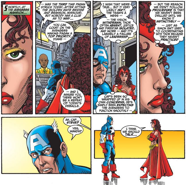 Cap seconds Wanda’s warning after the fact before giving a negative assessment of the team’s performance, fueling Wanda’s resentment (which has been building for several issues now).