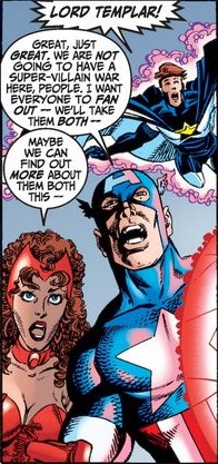 One idea is to rotate chairing weekly meetings, with Firestar taking first shot when they get news that Lord Templar has been spotted very near the headquarters of the Triune Understanding, the organization Triathlon is involved with. When Pagan shows up instead, Cap and Wanda disagree over jurisdictional matters, but Cap pulls rank as field leader.