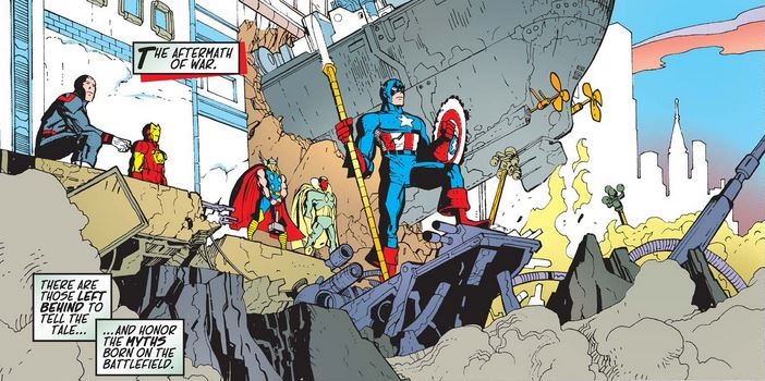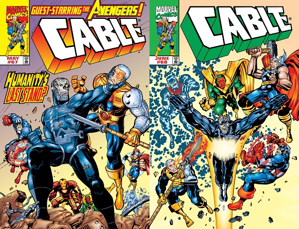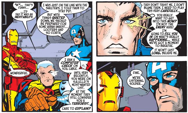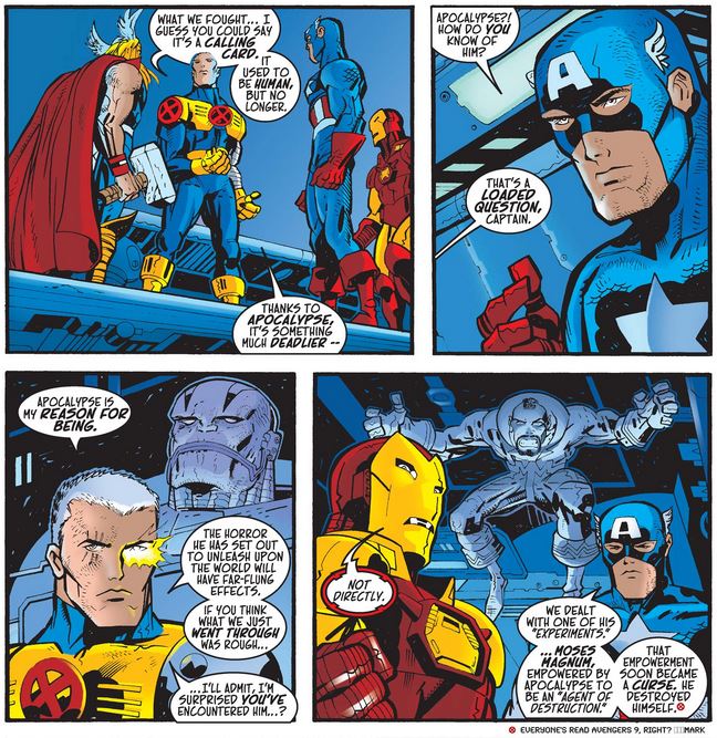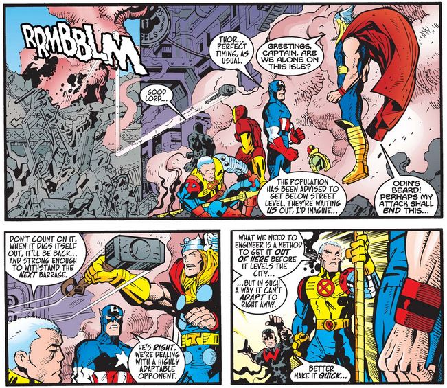 When Cable explains that, in the future when Apocalypse prevails, no one remembers the Avengers, Thor gets very upset thinking about his lost residuals, and Cap and Cable have a “grim resolve” face-off.