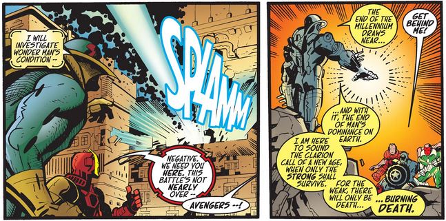 ALSO THESE MONTHS: Captain America #16 (April 1999), Avengers #15 (April 1999), Avengers Forever #5-6 (April-May 1999), Captain America: Sentinel of Liberty #8-9 (April-May 1999), Captain America #17 (May 1999), Avengers #16-17, Black Panther #8, and Magneto Rex #1 (May-June 1999), Captain America #18 and Nova #2 (June 1999), and Captain America: Sentinel of Liberty #10 (June 1999)