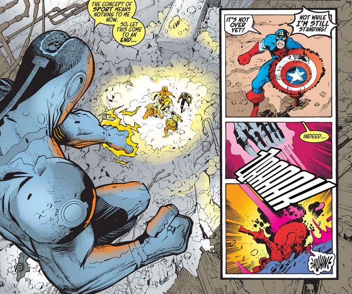 …and even more after he sends the Harbinger “elsewhere” (wherever that may be), after which Cap praises his efforts but wants to make sure they’re ready for round two.