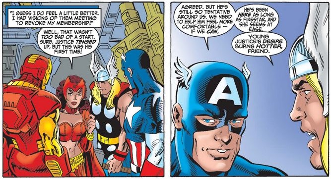 In Avengers #16, Justice takes his turn chairing a meeting and, predictably, stumbles nervously through it. While Firestar and Jarvis commiserate (leading to Justice’s dialogue box below), the Senior Avengers discuss his performance sympathetically, with Cap particularly concerned.