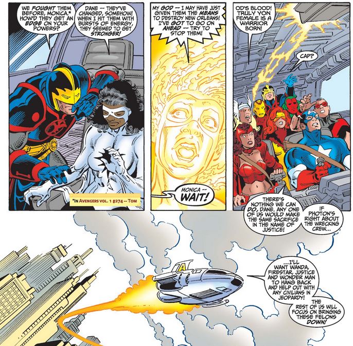 Following the Black Knight in arriving at the mansion is Photon (Monica Rambeau), who was attacked by the Wrecking Crew because the bumbling idiots thought she was Ms. Marvel (not Captain Marvel, as she was originally called). When she rushes ahead of the team to New Orleans to face them again, Cap praises her heroism before giving directions to the rest (dedicating half the team to protecting civilians).