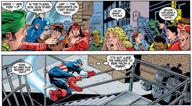 These same months see the Avengers show up in Black Panther, during a time when T’Challa had been overthrown as king. The rest of the team shows up on the last page of issue #7 to stop the Black Panther from killing Kraven the Hunter, but Cap doesn’t appear until issue #8, when he and the Panther try to calm a potential riot situation as thousands of New Yorkers gather to see the famous Wakandan. More interesting is the perspective of Everett Ross, the U.S. government liaison to T’Challa (and narrator of the series), who is cartoonishly cynical but can’t help but be drawn in by Cap’s aura. (In 2025 he would probably say rizz and all the kids around him would groan.)