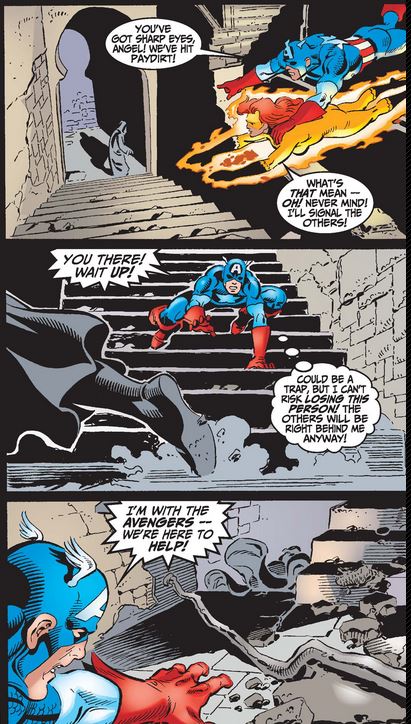 Firestar blames the Black Knight for the injury that kept Justice home during this mission, so she deftly follows up on Cap’s suggestion to look underground. (If you think it’s odd that Cap calls Firestar “Angel,” everyone does—her real name is Angelica.) Cap suspects a trap, but doesn’t want to pass up the chance to help someone who needs it…
