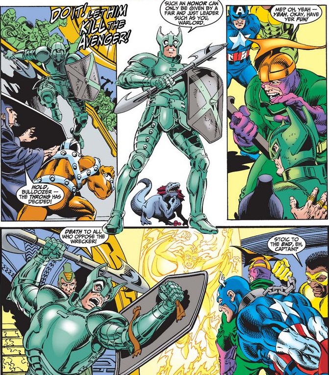 It turns out Wanda transported everybody to Polemachus, home of Arkon (from Avengers #75-76), but the place has seen better days, leading Cap to make a useful wartime analogy (as opposed to Wanda’s condescending one earlier).