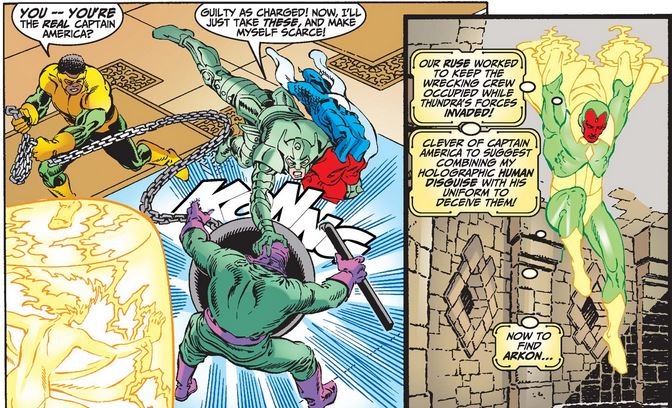 But it turns out the Green Knight is actually Cap, who reclaims his glove and shield in an unsuccessful attempt to free Photon…
