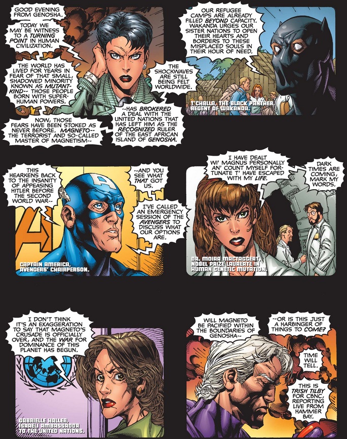 Finally, both Cap and T’Challa show up on one page from Magneto Rex #1, in which the world reacts (as explained below) to the United Nations agreeing to let Magneto proclaim himself ruler of the mutant nation of Genosha—and one may wonder how Magneto, as a Holocaust survivor, would take Cap’s analogy to the Munich Agreement allowing Hitler to take Sudetenland in 1938 in the hopes that he would stop his conquest in Europe (which, of course, he did not).