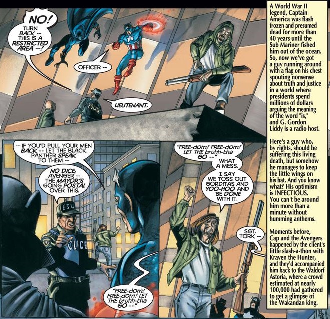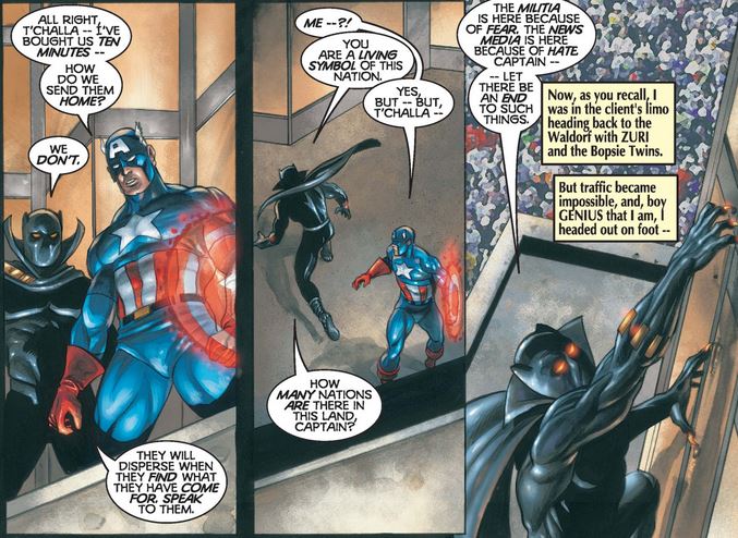Cap then asks T’Challa how to disperse the crowd, and the deposed king leaves it to the living legend of World War II, along with a riddle about the concept of nation and its relation to American unity.
