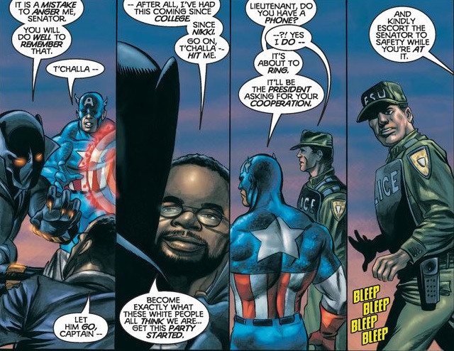 After trying to stop T’Challa from using the U.S. senator responsible for attracting the crowd as a scratching post—they have a long history besides—Cap clairvoyantly lets a campus police officer know he’s about to get an important call.