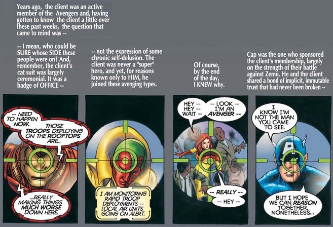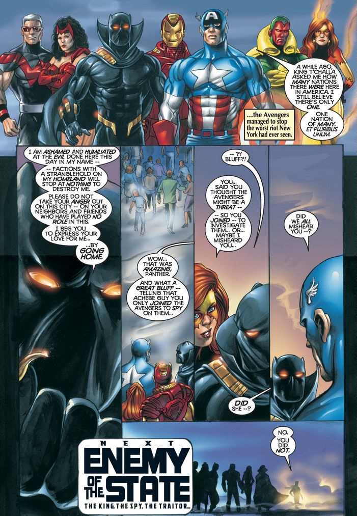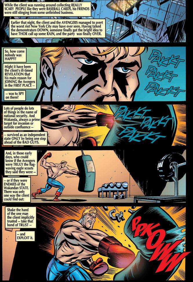 While the Avengers deal with the ensuing riot, and Cap tries to sub for the Black Panther, Ross ponders why T’Challa (“the client”) joined the Avengers in the first place…