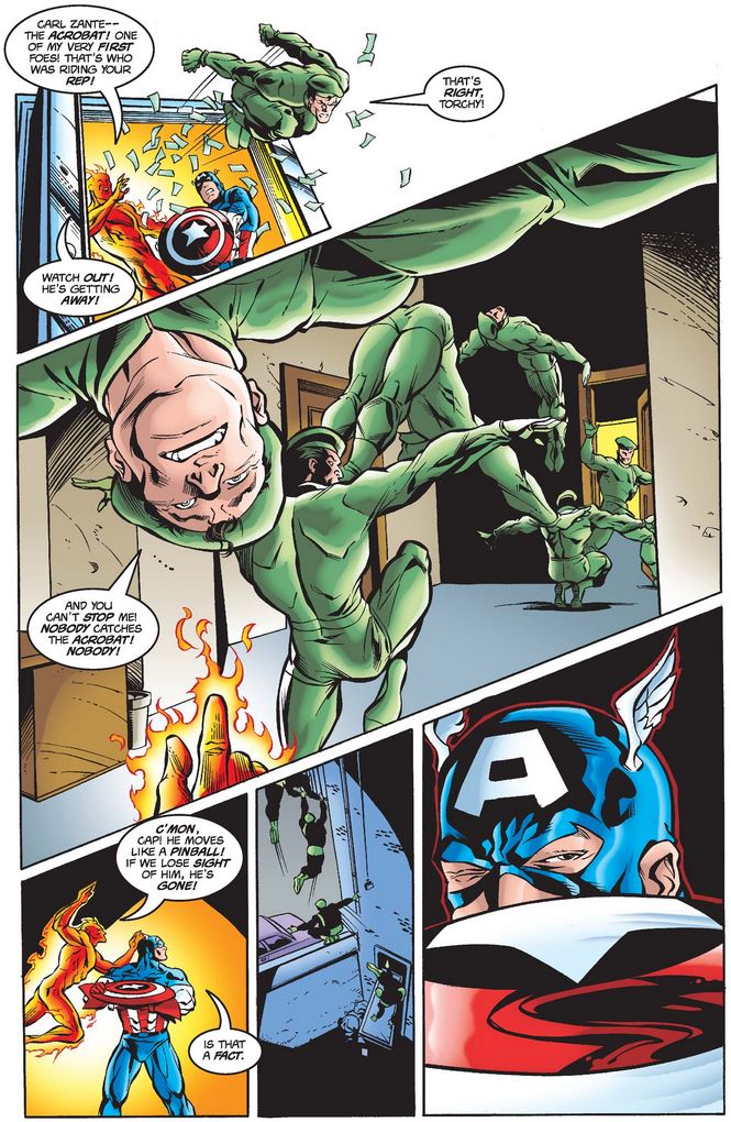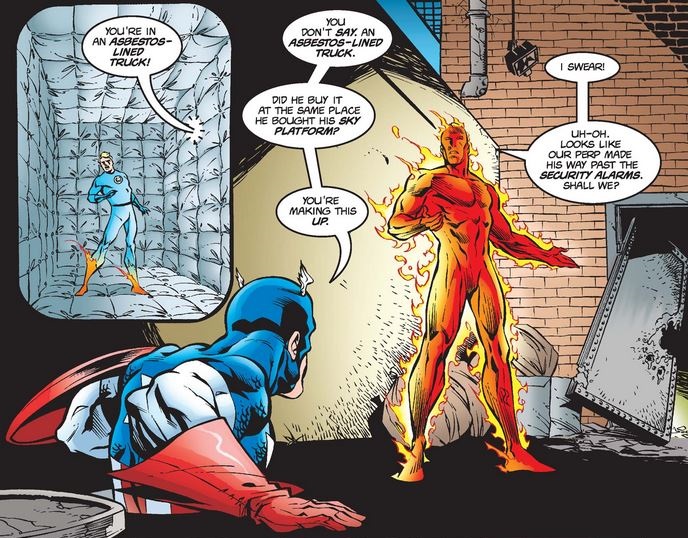 After hearing another implausible bit of Johnny’s tale, Cap and Flaming Bucky find themselves close to the person they are chasing in the present day…