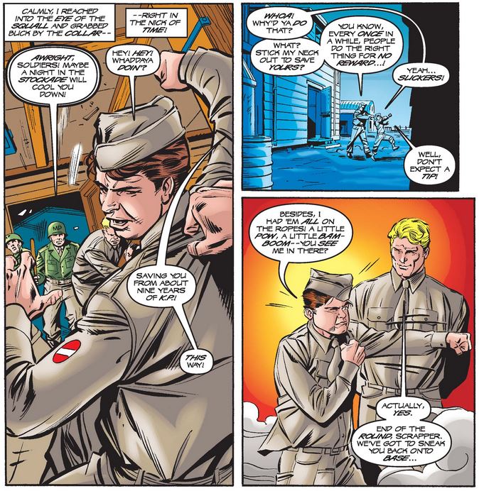 Not an unreasonable suspicion, to be fair, based on which Smitty and his unnamed pal here lay into Steve, who’s hesitant to defend himself too well—and doesn’t have to, after Bucky intervenes physically and fingers another GI named McGurk who had just stiffed him on a deal.