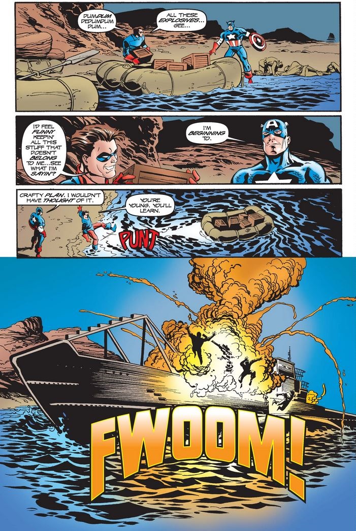 On their first mission together, they intercept a German U-boat in Virginia, planning to blow up an American base, and after defeating the Nazis, Bucky conscientiously returns their explosives.