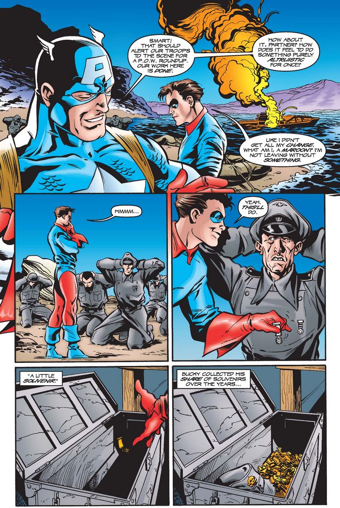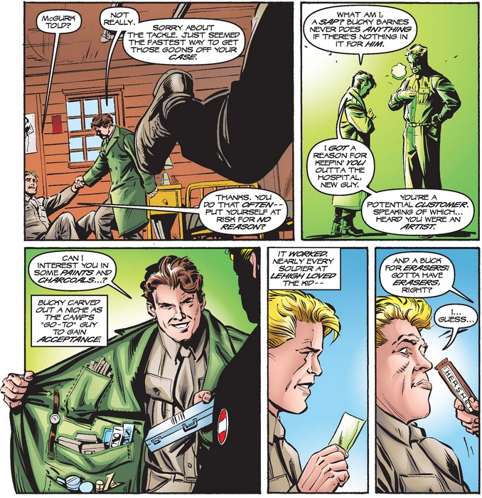 In the final issue of the series, Cap thinks back to his time with Bucky, here portrayed as quite the dealmaker, procuring goods and trading in illicit information with the troops while longing to mix it up with the Axis forces. We see this in a flashback to their first meeting, which also references Steve Rogers’ artistic bent.