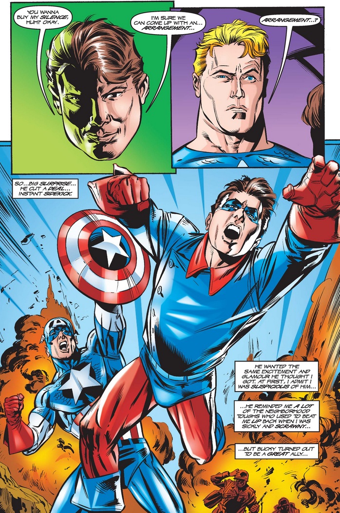 Captain America: Sentinel of Liberty (vol. 1) #12, August 1999: Mark Waid (writer), Doug Braithwaite and Anthony Williams (pencils), Dan Green and Scott Koblish (inks), Matt Hicks (colors), “Bullpen” (letters). (More details at Marvel Database.)