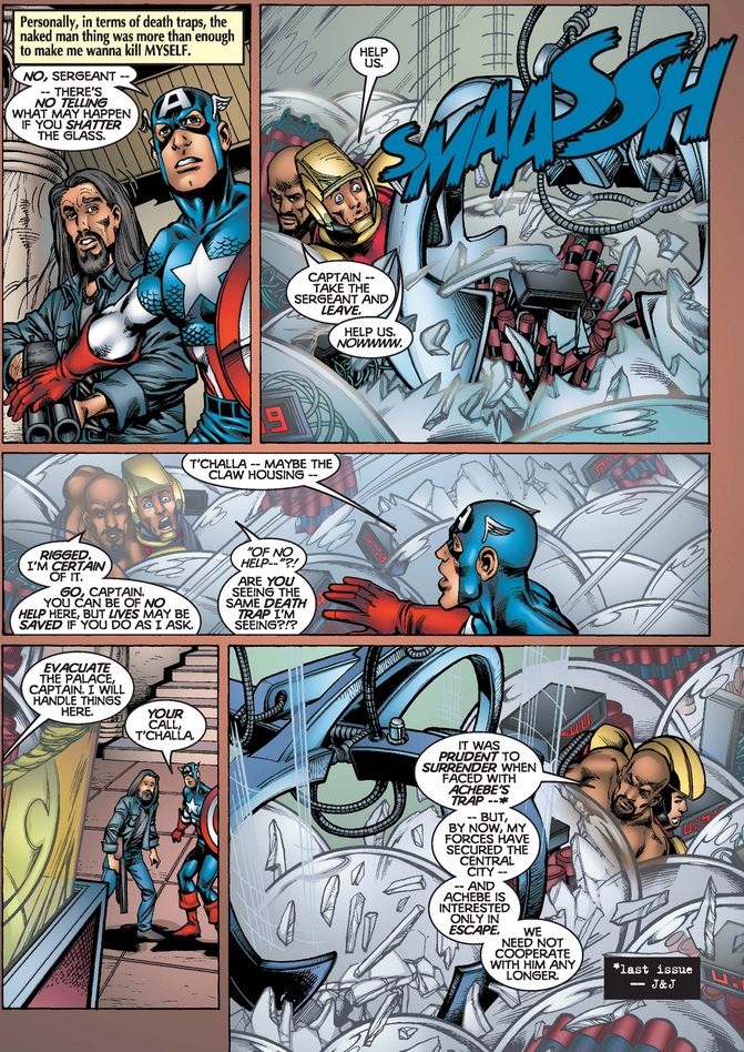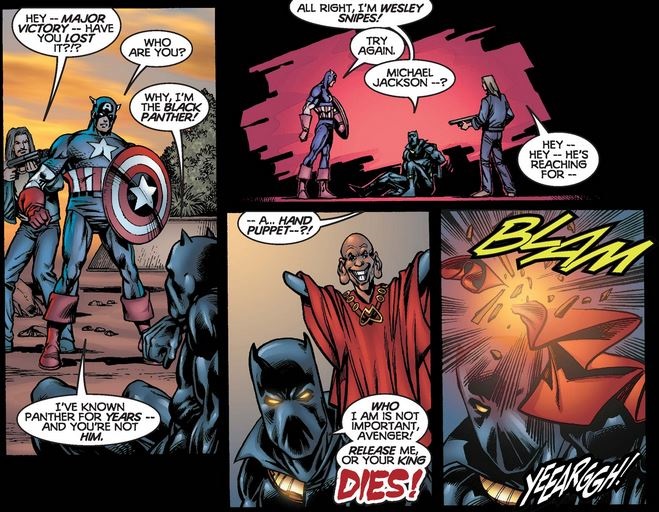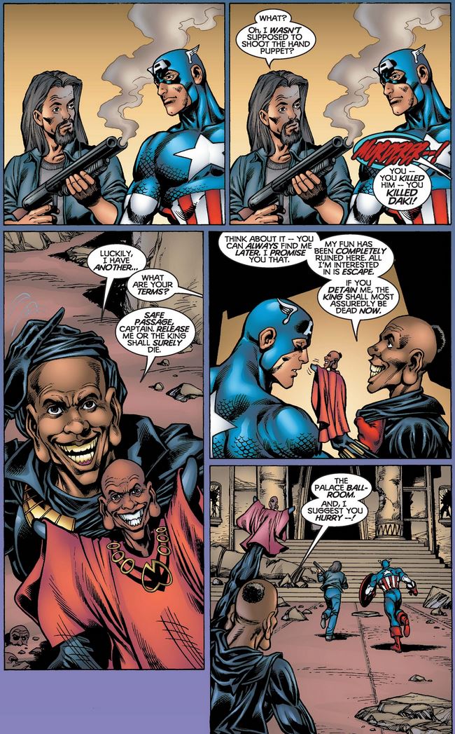The “Black Panther” turns out to be Achebe, the usurper of the throne (and the man behind the riot in issue #8) who has been gradually going mad (hence the puppet). But at least he tells Cap and Not-Nomad where the real Panther is…