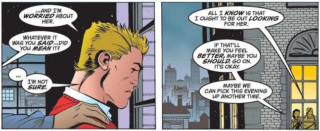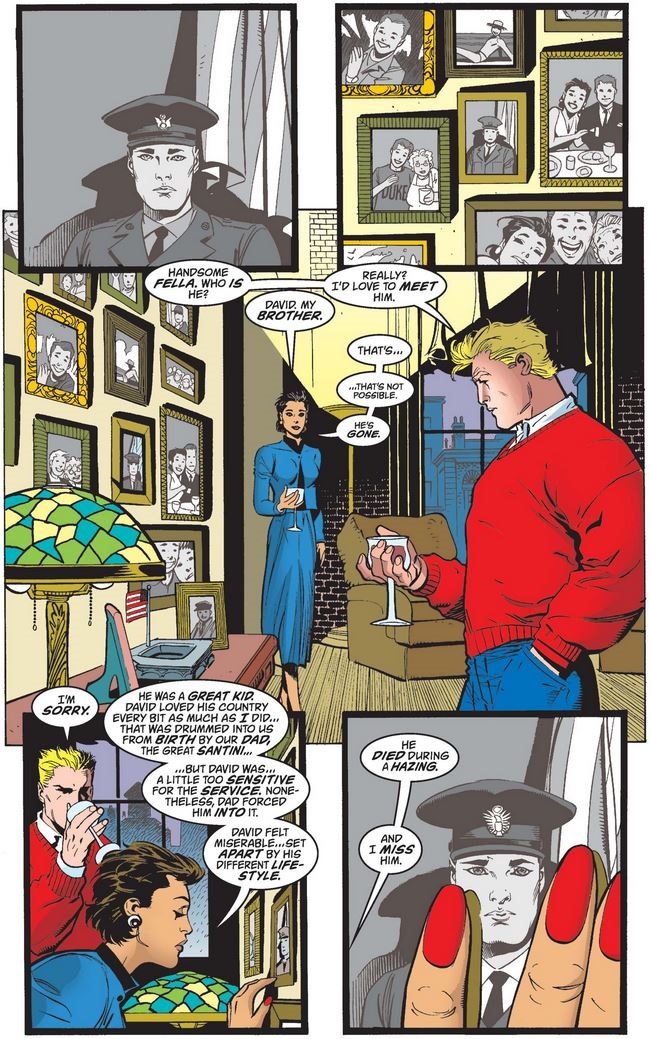 …and learns that she has an issue with the U.S. military’s stance, formal and informal, toward homosexuality. This obviously gives Captain America pause and leads him to reconsider telling her about his other life, despite his ambiguous official status—and then she asks about “the other woman,” which may or may not be a welcome change of topic.