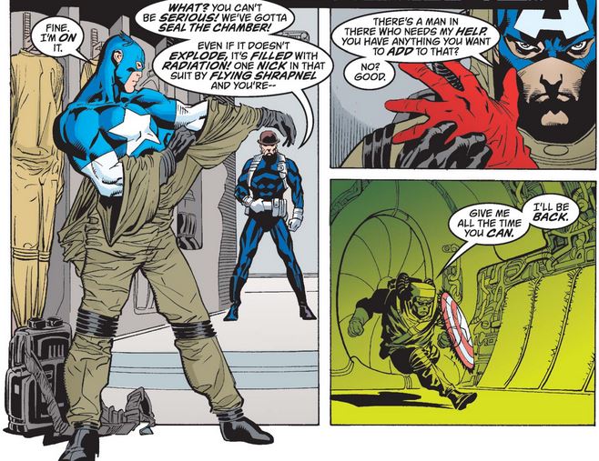 Things get worse when the helicarrier’s power core, which contains you-know-that, also starts to explode—and with an agent inside, paralyzed with fear. Again, Cap does not hesitate to jump into the breach, despite Dum Dum’s warnings, giving him all the explanation he needs.