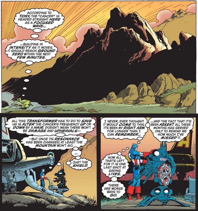 In issue #22, Cap flies to Wakanda with his taped-up shield and sets it up in Tony’s machine to intercept the “vibrational cancer” and negate it before it reaches the vibranium mountain, telling himself that it’s a heroic ending for a good friend.